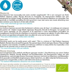 De kiemspruiten hebben een zeer aangename en pittige smaak. De jonge scheuten zitten boordevol vitaminen en mineralen. Een gezonde en heerlijke aanvulling bij veel gerechten maar met name een mooie afwerking voor een oosterse curry, bij taco’s of een sateschotel