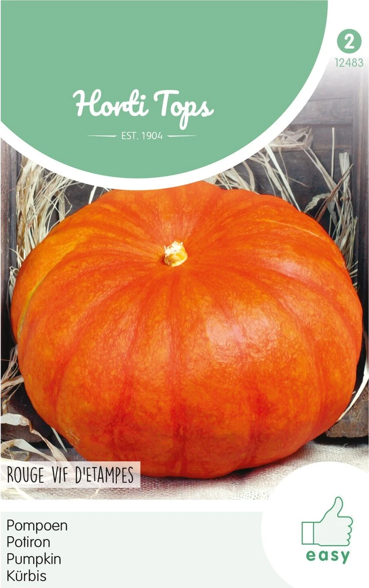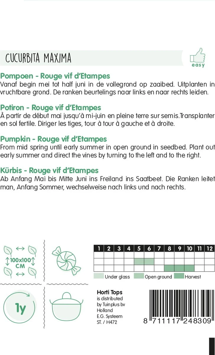 Pompoen – Rode van Etampes. Vanaf begin mei tot half juni zaaien in de volle grond op een zaaibed. Uitplanten in vruchtbare grond. De ranken beurtelings naar links en naar rechts leiden.