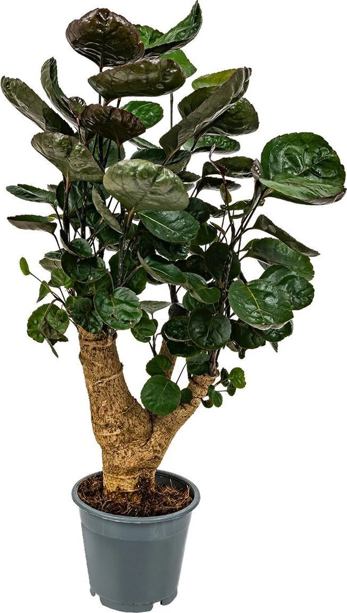 Hier zie je de Polyscias scutellaria ‘Fabian’. Een klein boompje voor bij jou in huis! Oorspronkelijk groeit de Polyscias op eilanden in de Pacifische oceaan. In het wild worden deze bomen zo’n 2 – 6 meter hoog en zorgen ze met hun grote bladeren voor veel schaduw. Polyscias betekent dan ook ‘veel schaduw’ in het Grieks. ‘Fabian’ heeft echter een handiger formaat, zodat je binnenshuis ook van deze prachtboom kunt genieten. Deze compacte kamerplant heeft een dikke houten stam. Dit kleine, vertakkende boompje krijgt bladeren over de volledige lengte van zijn takken. Dit zorgt voor een fijne mix aan natuurlijke kleuren. De donkergroene bladeren hebben een leerachtig karakter en krullen enigszins naar buiten. Aangezien dit dwergboompje mooi recht en compact blijft, heb je zo een plekje gevonden in huis. Deze stoere blikvanger zorgt gegarandeerd voor sfeer in ieder interieur.