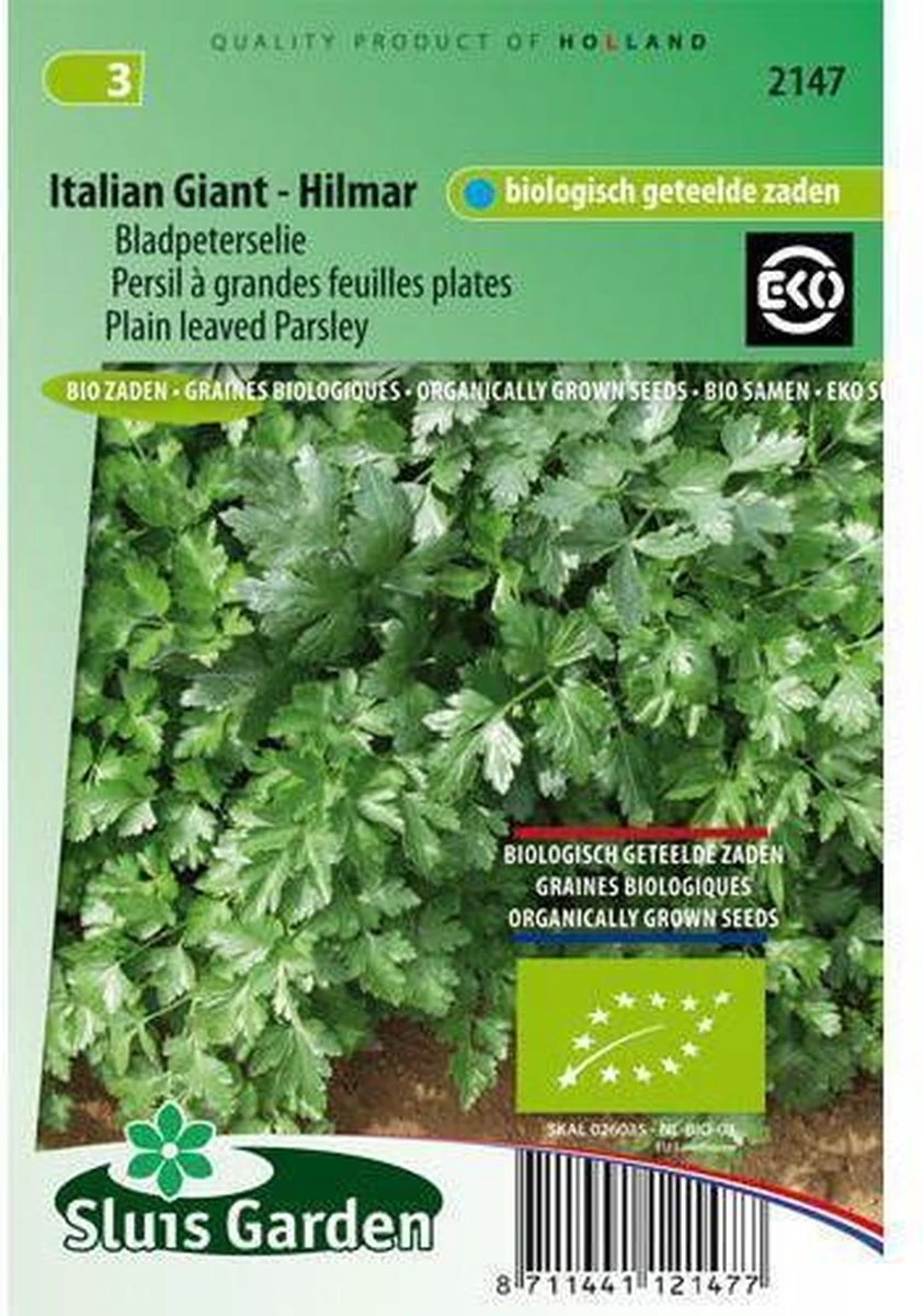 Biologisch geteelde zaden. Zeer aromatisch en grover/grootbladiger dan de gewone ‘platte peterselie’. Heeft diepgroene, gladde bladeren en heeft, door een hoger watergehalte en een hoger gehalte aan etherische oliën, een fijnere smaak dan de krulpeterselie. Groeit steeds opnieuw uit. Zaaien onder glas of in vollegrond op regels. Kiemt vaak wat langzaam. Grond na het zaaien vochtig en onkruidvrij houden. Uitstekend in potten, bakken etc.Biologisch geteelde zaden * Dit zaad is geteeld, geschoond en verpakt volgens de biologische productie methode, welke is vastgelegd en gecontroleerd door de stichting SKAL – nummer 026035 / NL-BIO-01